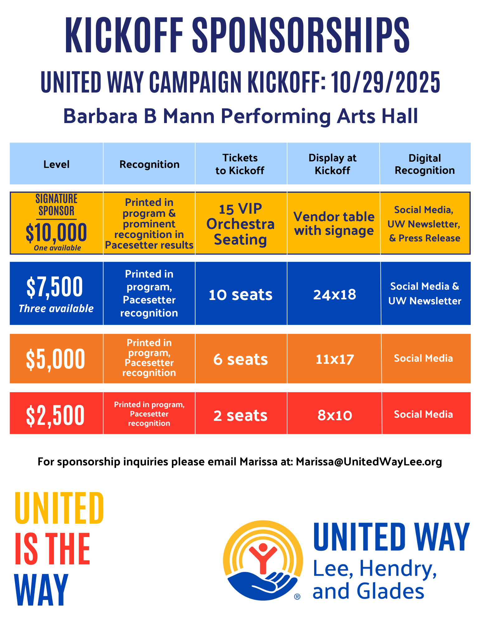 - Prominent recognition at the United Way Campaign Kickoff planned for Wednesday, October 29, 2025, at Barbara B. Mann Performing Arts Hall.