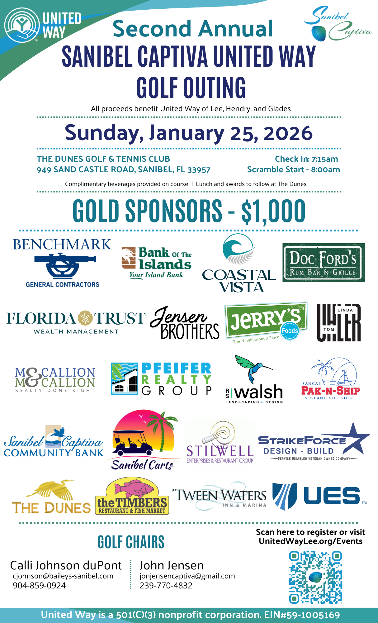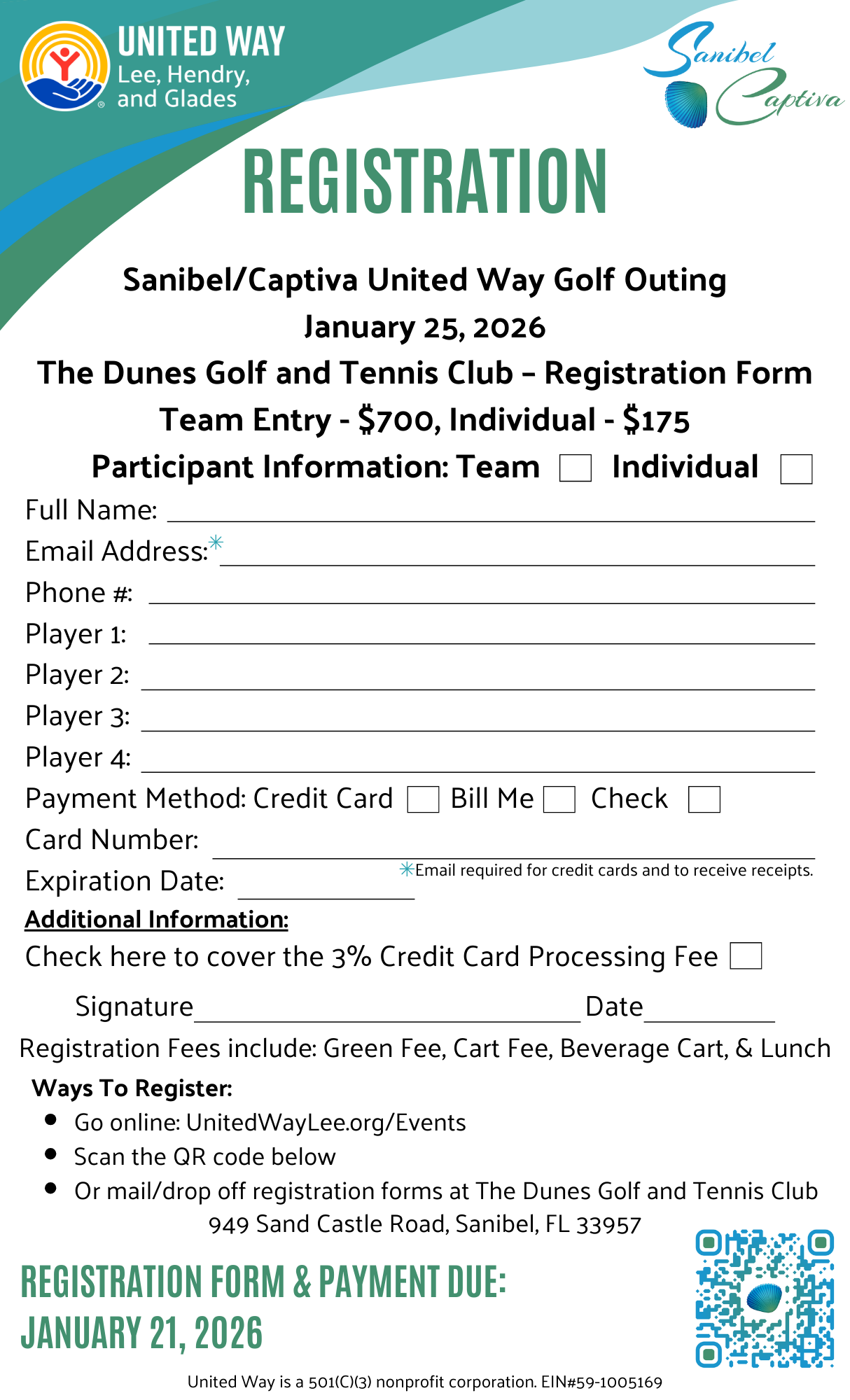 Name First Last Adress Address Address 2 City/Town State/Province - None -AlabamaAlaskaAmerican SamoaArizonaArkansasArmed Forces (Canada, Europe, Africa, or Middle East)Armed Forces AmericasArmed Forces PacificCaliforniaColoradoConnecticutDelawareDistrict of ColumbiaFederated States of MicronesiaFloridaGeorgiaGuamHawaiiIdahoIllinoisIndianaIowaKansasKentuckyLouisianaMaineMarshall IslandsMarylandMassachusettsMichiganMinnesotaMississippiMissouriMontanaNebraskaNevadaNew HampshireNew JerseyNew MexicoNew YorkNorth CarolinaNorth DakotaNorthern Mariana IslandsOhioOklahomaOregonPalauPennsylvaniaPuerto RicoRhode IslandSouth CarolinaSouth DakotaTennesseeTexasUtahVermontVirgin IslandsVirginiaWashingtonWest VirginiaWisconsinWyomingAlbertaBritish ColumbiaManitobaNew BrunswickNewfoundland and LabradorNova ScotiaNorthwest TerritoriesNunavutOntarioPrince Edward IslandQuebecSaskatchewanYukon ZIP/Postal Code Email Phone Company Name if applicable Sponsorship Level $1,000 - Gold Sponsoprship Package Logo on Flyer Prominent Display Day of Outing Welcome to Join us for Lunch $500 - Silver Sponsorship Package Name Listed on Flyer Prominent Display Day of Outing Welcome to Join us for Lunch Payment Method Check Credit Card Player Information Player One Player Two Player Three Player Four Gold Player Information Gold- Player 1 Gold - Player 2 Gold - Player 3 Gold- Player 4 Submit Make checks payable to United Way of Lee County and mail to 7273 Concourse Dr. Ft. Myers, FL 33908 Proceed to Payment
